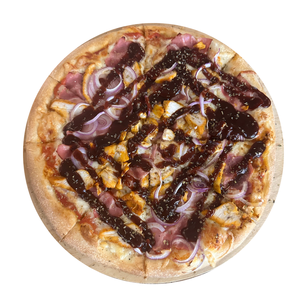 Sos pomidorowy, ser, kurczak, bekon, cebula czerwona, sos BBQ